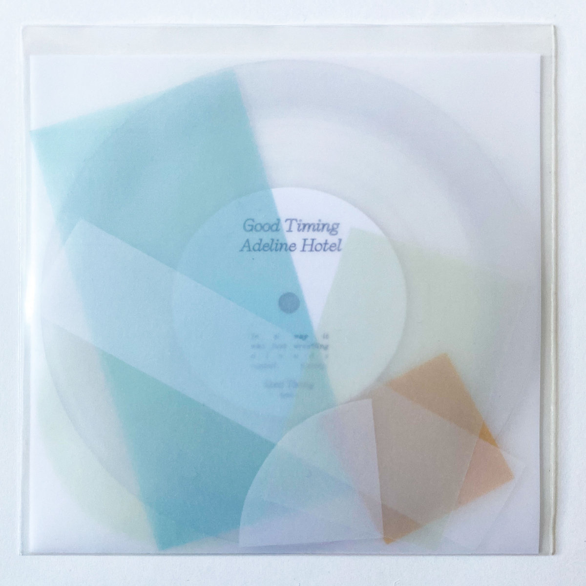 Clear vinyl 7" of Good Timing b/w I Have Found It in kaleidoscope vellum sleeves custom made by Chrissy Ziegler. Sleeves shape-shift into a new pattern with each play.